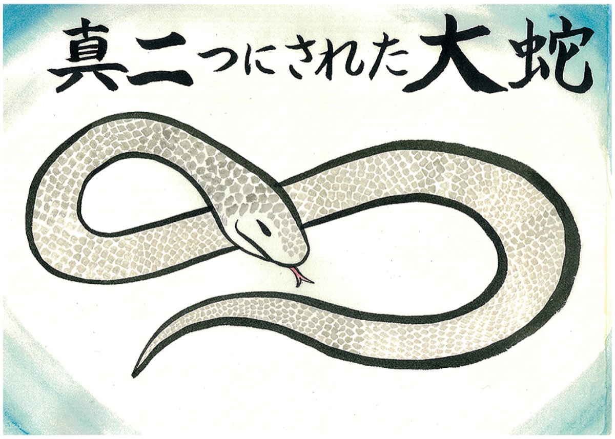 ※保土ケ谷に伝わる民話や昔話を題材にして制作した紙芝居で口演活動を行っている市民グループ「『ほどがや』えかたり〜べ」(篠崎顕一代表)の作品『真二つにされた大蛇』(原作=保土ケ谷に伝わる民話)より抜粋。