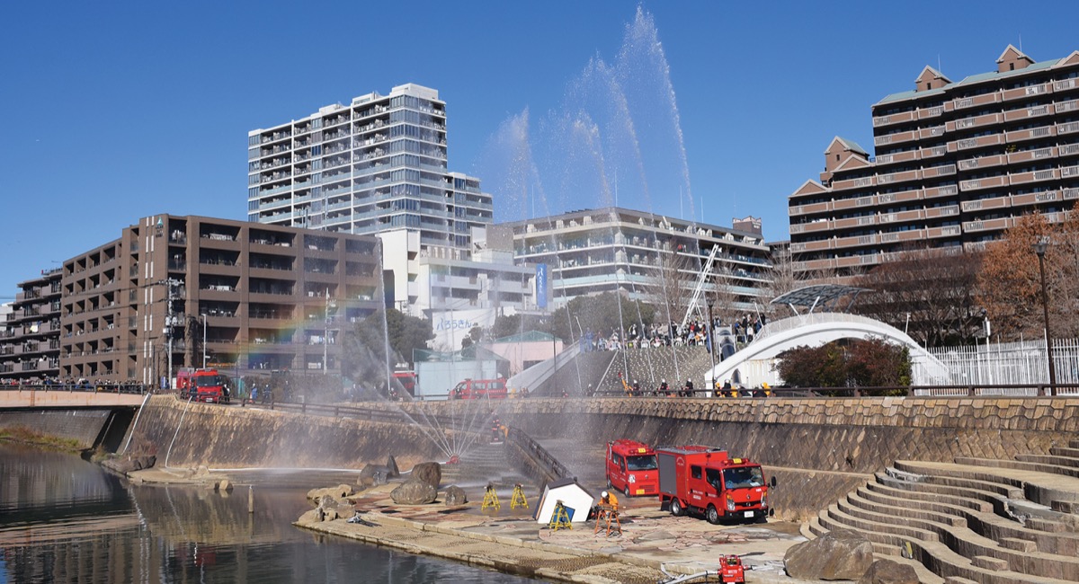2部は保土ケ谷消防団などの活動紹介が行われた後、公会堂前で地震発生時を想定した消防訓練を実施。消防ヘリコプターが上空を飛行し、臨場感あふれる一斉放水が行われると、住民から歓声が沸き起こった。出初式に参加した男性は「一斉放水が迫力満点で、それによる虹がきれいだった。吹奏楽なども感動した」と感想を述べた。