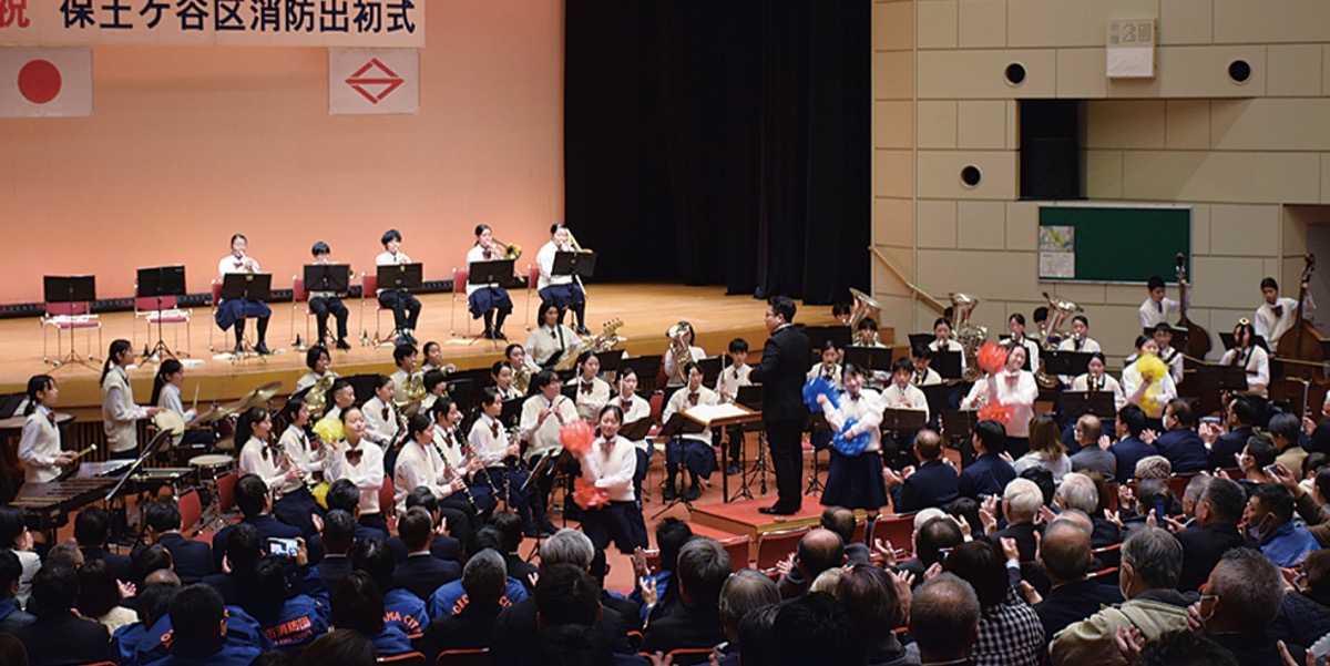 2部形式で実施。1部は式典があり、消防活動に功績があった人が表彰された。無病息災などを願う西谷地区の郷土芸能「西谷囃子」(白井秀幸会長=人物風土記で紹介)の公演も行われ、獅子舞やひょっとこが登場して会場を盛り上げた。また、保土ケ谷中学校吹奏楽部がミニコンサートを開催。これまでに全国大会に出場経験があるなど、貫禄のある演奏で観客を魅了した。