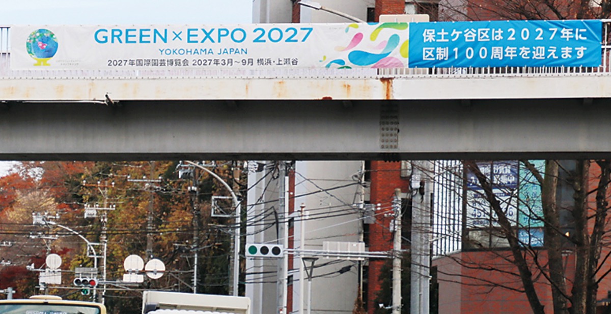 横断幕は昨年に続き、狩場町第二歩道橋と狩場町第三歩道橋のほか、新たに保土ケ谷駅東口歩道橋に掲示。「保土ケ谷区は2027年に区制100周年を迎えます」などのメッセージとともに「GREEN×EXPO2027」などの文言が入っている。