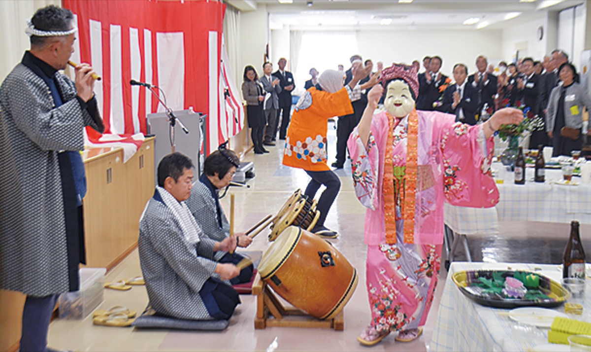 あいさつや食事だけに限らず、毎年さまざまな仕掛けで盛り上がる賀詞交換会。今年は三味線と獅子舞の公演が行われ、石川会長や神部浩保土ケ谷区長らが手拍子を送って会場を盛り上げた。