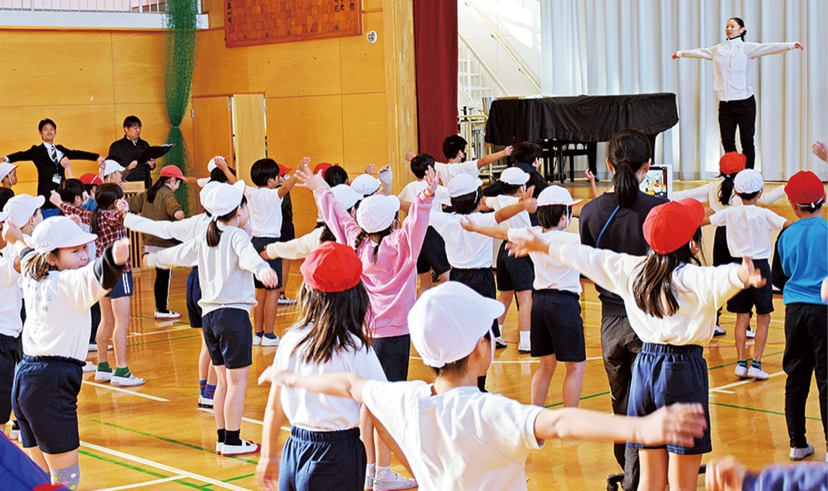 児童の元気な体作りを目指す同校は今年度、運動会や修学旅行など日常生活の中にラジオ体操を取り入れる活動を継続して行ってきた。その一環で「第11回全国小学校ラジオ体操コンクール」に応募したところ、取組部門で「かんぽ生命特別賞」を受賞したことで、今回の出張授業が実現した。
