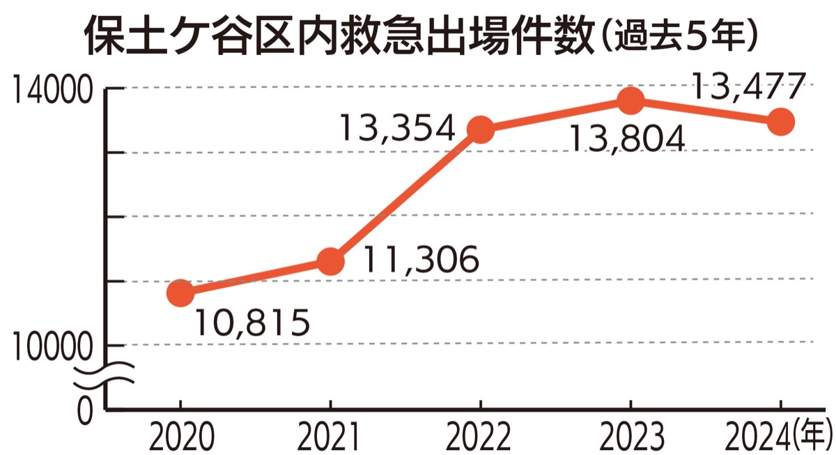 2024年の救急概況(速報値)がこのほど横浜市から発表され、保土ケ谷区内の出場件数は1万3477件だった。過去最多を記録した23年から327件減少したことについて、保土ケ谷消防署は「現時点で減少理由は明確に分からないが、救急車の適正利用などの啓発に取り組んでいる」としている。