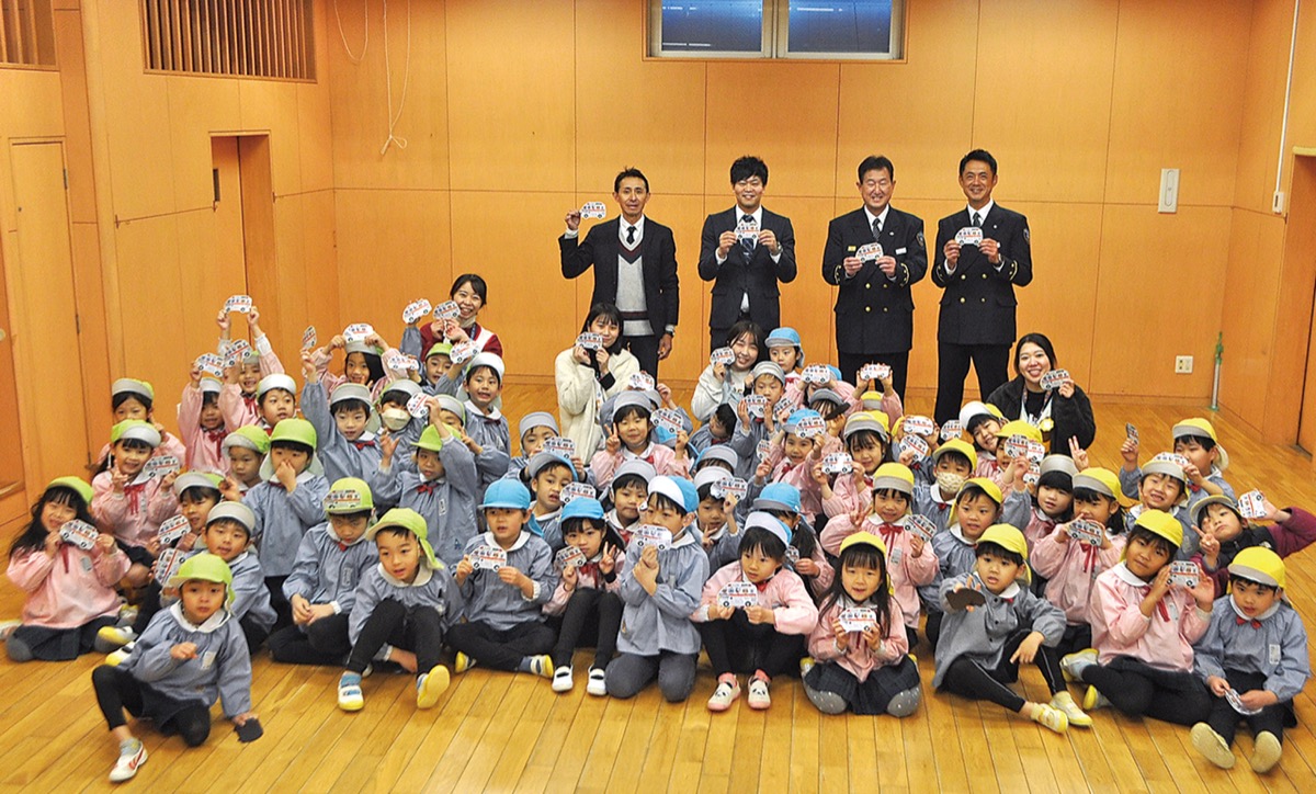 ステッカーの完成を記念し、1月29日に峰岡町の峯岡幼稚園でステッカーのお渡し会を実施。上原支配人と署員が園児に手渡した。上原支配人は「皆さまに運動習慣を身につけていただくことが私たちの役目。地域の健康増進に貢献できれば」と話した。