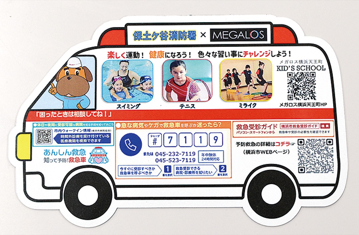 保土ケ谷消防署はスポーツクラブのメガロス横浜天王町(上原章吾支配人)と連携し、子どもの病気やけがを未然に防ぐ取り組みなどを記載した「救急車型マグネットステッカー」を1万個作った。2、3月をめどに保土ケ谷区内の幼稚園・保育園に通う全園児に配るほか、防災イベントにも活用する。