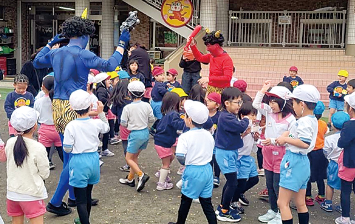 渡邉園長によると、鬼行列は同園で40年以上続いており、園児が地域の鬼を退治するという恒例行事となっているという。鬼の角を頭に着けた園児や鬼のお面をかぶった園児は園庭で豆まきをした後、園の外へ。