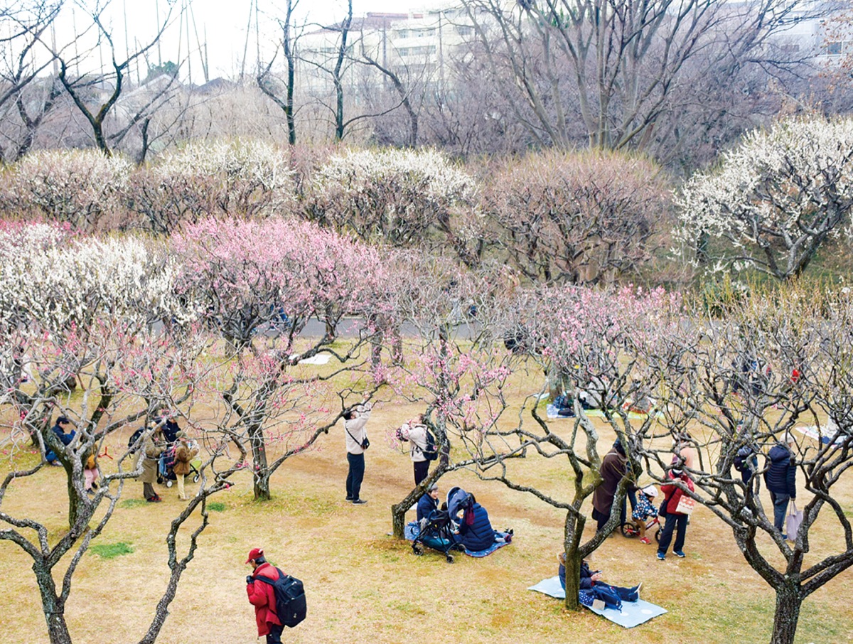 約40種90本の梅が植えられた梅園では、赤や白といった色の花を咲かせた梅が来園者を出迎えた=写真。会場ではブルーシートや簡易テントなどを広げてゆっくりと花を楽しむ人や、携帯電話やカメラで花の写真を撮る人の姿があった。