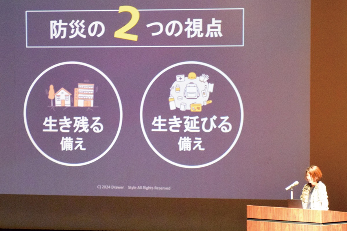 第1部の講演会では、Drawer Style代表の中村佳子さんが登壇。防災士や片付けのプロとしての視点で災害への備えについて話した。
