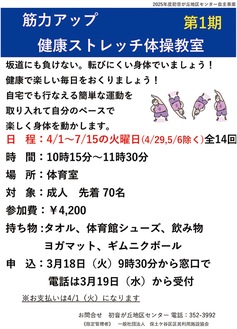 初音が丘地区センター(藤塚町15の1)の体育室で4月1日(火)から、「筋力アップ 健康ストレッチ体操教室」がスタートする。