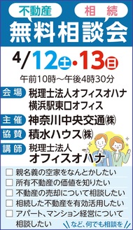 不動産の売買や税務、資産活用など、相続や不動産に関することに専門家が応える無料相談会が4月12日(土)・13日(日)に横浜駅前の会場(JR横浜駅徒歩8分)で開かれる。主催は神奈中バスでおなじみ神奈川中央交通株式会社(積水ハウス協賛)。事前予約制で参加者を募集中だ。