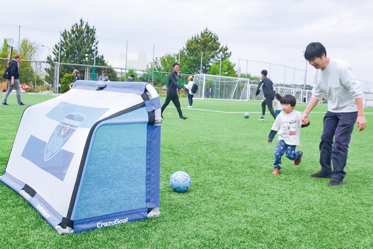 同イベントには生後7カ月から5歳児までが保護者と参加。横浜FC普及ダイレクターの鯨井健太さん、元選手でクラブリレーションズオフィサーの内田智也さんを講師に迎え入れ、サッカーボールを使った遊びを体験した。子どもたちは芝生のグラウンドを全速力で駆け回り、保護者と共にシュートを放った。