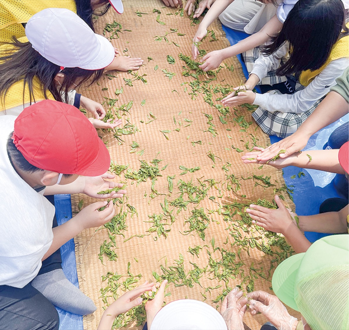 この日は同公園の茶樹を管理する「茶樹の会」(佐藤貞夫代表)のメンバーが、茶葉の先端にある芽とその下の葉を摘む「一芯二葉」という摘採法を児童に指導。児童は一番茶を摘み取った。