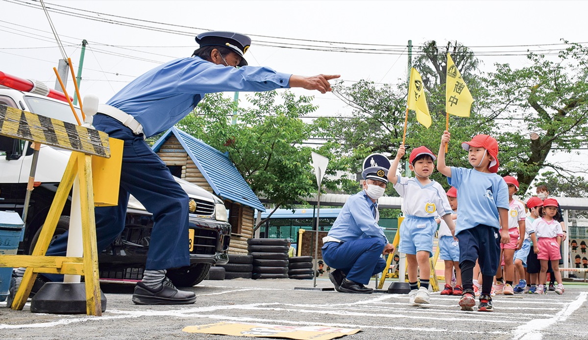 この日は同園年中組の計約80人が参加。園児は、同署の警察官から「道路で遊ばない」「道路へ飛び出さない」「止まれの標識がある場所では止まって左右を確認する」といった交通安全に関する基礎知識を学んだ。その後は園庭に作られた横断歩道を横断旗を掲げながら渡る体験を行った。園児は2人1組になりながら、信号機のある交差点では青になったことを確認し、事前に指導を受けた横断歩道を渡る最中も車が来ていないか左右を確認することを実践していた。
