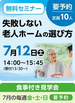 横浜駅から徒歩8分の好立地にある住宅型有料老人ホーム「シニアホテル横浜西口」で7月12日(土)、無料セミナー「失敗しない老人ホームの選び方」が開かれる。いざという時のために知っておきたい「高齢者施設の種類」「施設選びの問題点やポイント」「施設の費用」などを分かりやすく解説。これまで2千人以上が参加した好評のセミナーだ。午後2時〜3時45分。要予約で定員は先着10人。申し込みは同施設【電話】045・755・7200へ。