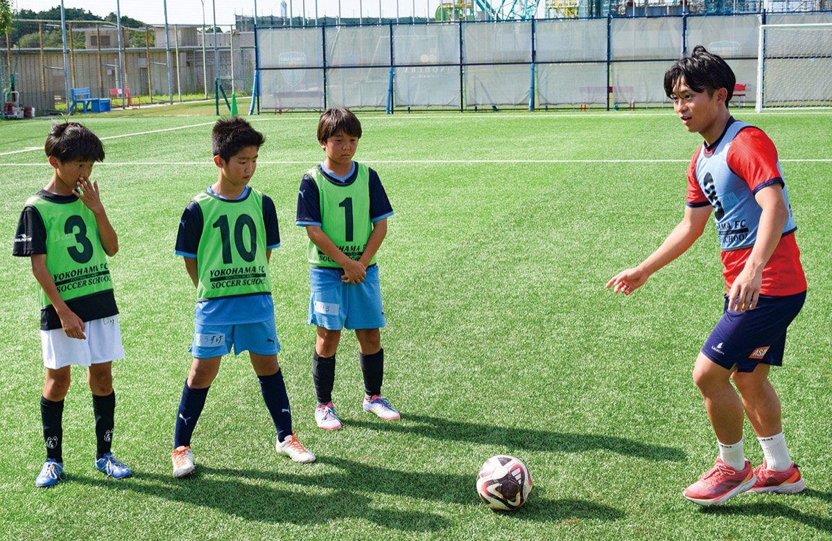 前半に行われたサッカー教室では、横浜FCから期限付き移籍でポルトガルのUDオリヴェイレンセに所属する永田滉太朗選手、高橋友矢選手のほか、キーティングタイラー選手(オリヴェイレンセ所属)や横浜FCの元選手で現在は同クラブリレーションズオフィサーを務める内田智也さんが子どもたちを指導。パス、ドリブル、ディフェンスの部門に分かれて行った。