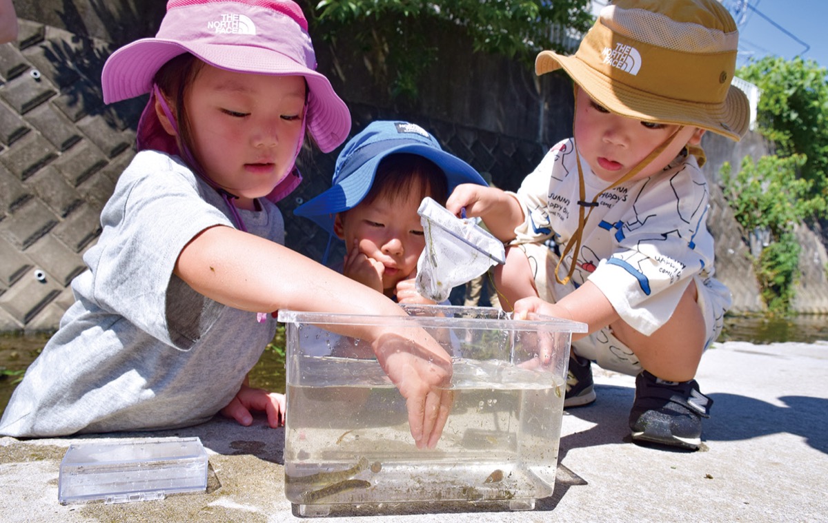 この日は、15年以上「海の日」に実施している動物調査で、近隣の岩崎小や瀬戸ケ谷小の児童と保護者らが参加した。参加者は魚取り網を片手に川の中に入り、今井川に生息する生物を探した。同愛護会の会員のアドバイスを受けながらガマの根元付近などを網ですくうと、ウキゴリやカワニナ、ドジョウなどを発見。生き物が好きだという三田陸翔くん(岩崎小3年)と参加した父親の博文さんは「身近な川に色々な生き物がいることを知ってもらえる良い機会になった」と話した。