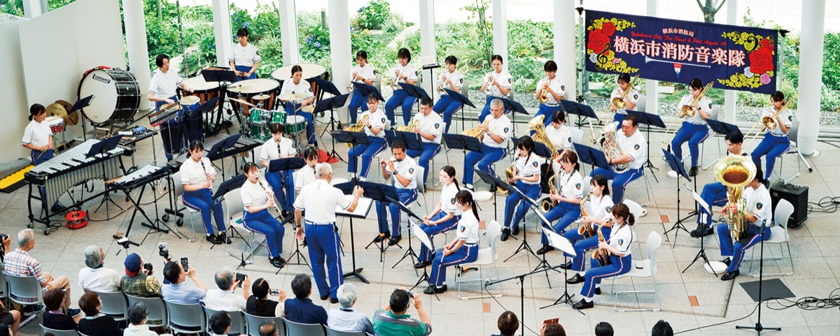 7月1日に市役所のアトリウムで行われた横浜市消防音楽隊によるお披露目コンサートには、約280人の観客が集まり、初の演奏を楽しんでいた。