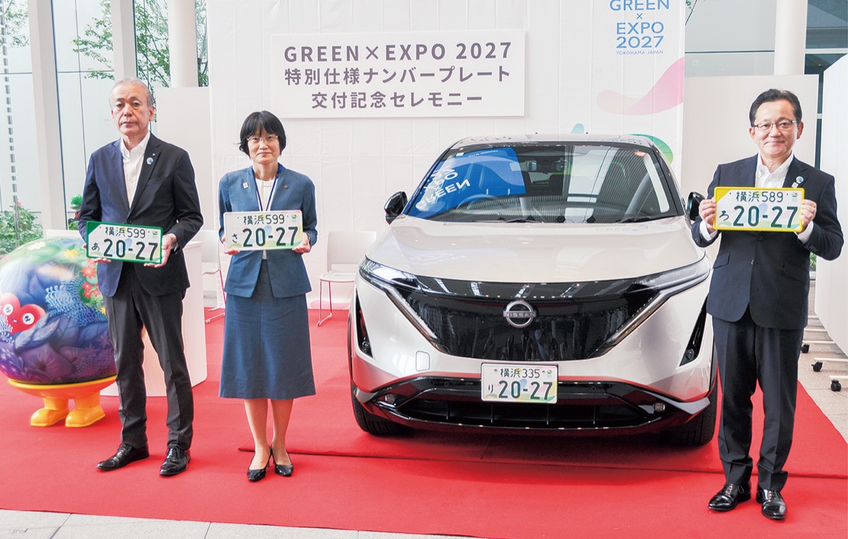 「GREEN×EXPO 2027」(国際園芸博覧会)特別仕様のナンバープレートの交付が、7月14日から始まった。同日には横浜市役所で記念セレモニーがあり、同プレートを取り付けた横浜市の公用車がお披露目された。