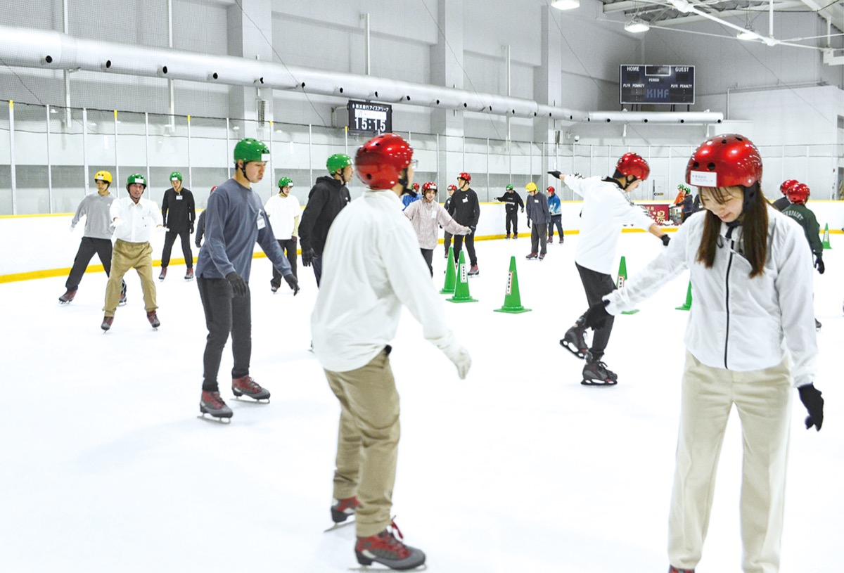 今回のテーマは「アイススケートを通して横浜の魅力に迫る」。教員たちは講師からスケート靴の履き方や安全な滑り方を教わった後、実際にリンク内を滑った。最初は手すりにつかまる人も多かったが、練習の後半はほとんどの教員が手すりにつかまらずにスケートリンクを滑っていた。