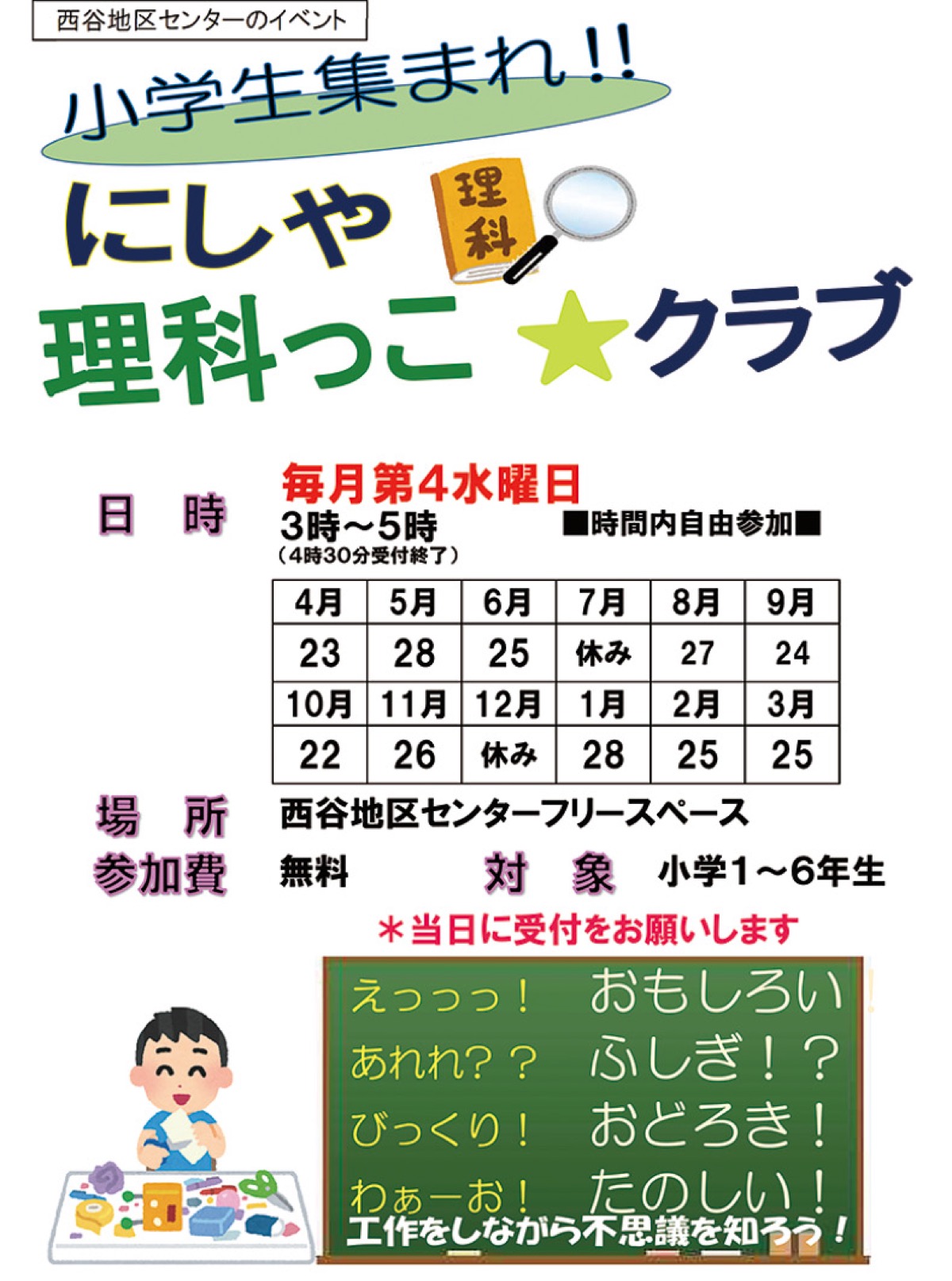 西谷地区センター(西谷3の15の1)内のフリースペースで9月24日(水)、「にしや理科っこクラブ」が開催される。