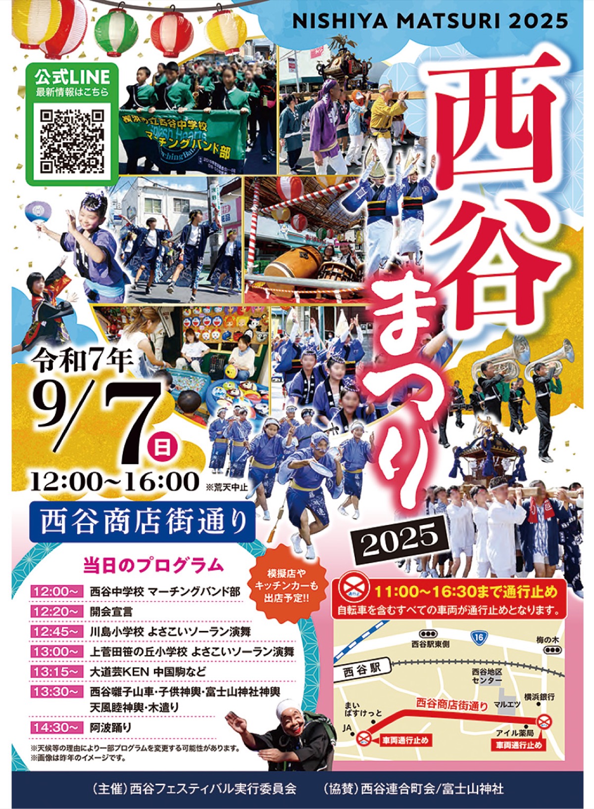 西谷エリアの夏の風物詩として親しまれる祭り。西谷フェスティバルなどの名称を経て、2023年に西谷まつりにリニューアルして開催している。