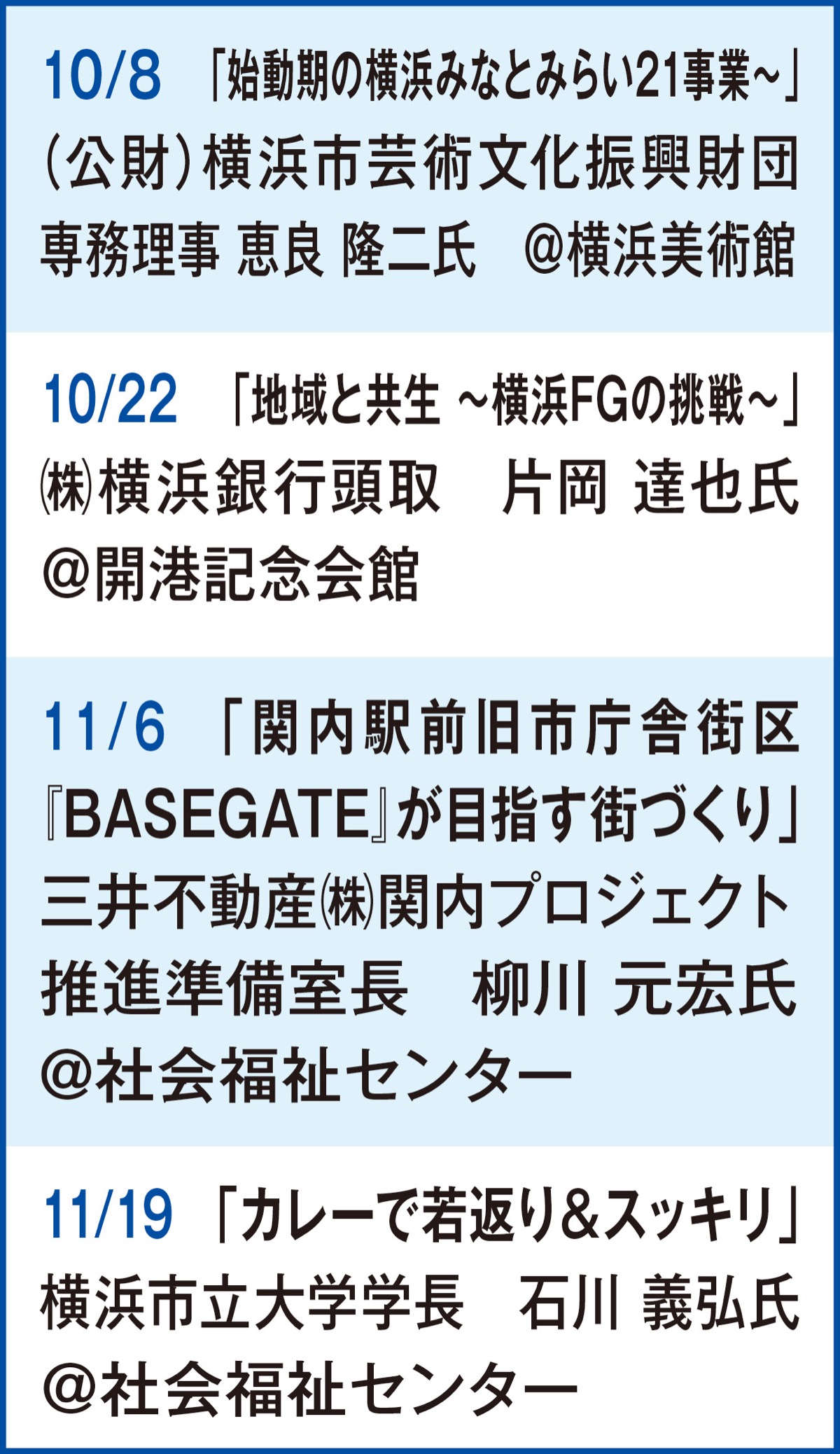 横浜市民プラザ=中区本町=は、秋期の「横濱市民講座」を開講している。会場は、横浜市社会福祉センターや開港記念会館、横浜美術館。時間はいずれも午後6時30分〜8時。費用は1講座2200円。法人、個人ともに年間の聴講券が付く、会員も募集中。次回は10月8日(水)で11月19日(水)まで4回開催される。