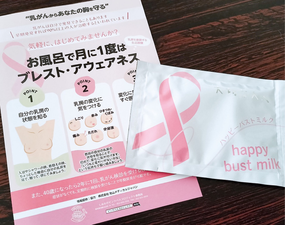 乳がんは男性にも起こり得るということから同施設では、男性自身のセルフチェック、パートナーに検診を勧めるきっかけになるようにと当日の入浴者先着1千200人に「ハッピーバストミルク」(乳液)とセルフチェックガイドを配付する。