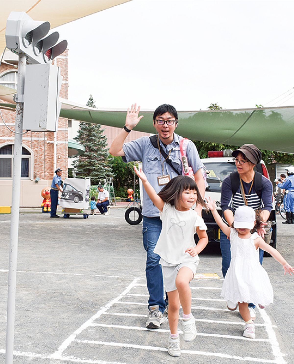 園庭では実技コーナーとして横断歩道を再現。参加者は、左右を確認してから手を挙げて横断歩道を渡るよう同協会会員らから指導を受けた。また、自転車の点検ポイントとしてブレーキ、タイヤ、車体、反射材、ベルなどを乗る前に確認することが推奨されていた。また、同園のホールでは交通安全に関する紙芝居が披露されたほか、同署署員は子どもたちに対し「道路を渡る時はお家の人と手をつなごう。道路では遊ばない。横断歩道を渡る時は右、左、右を見てから手を挙げて」と呼び掛けていた。