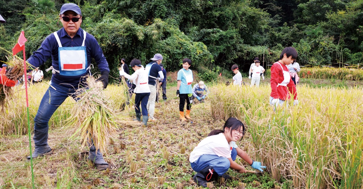 児童は同団体のメンバーに鎌の使い方などを教わり、器用に稲刈りを実施。刈り取った稲を紐で結び束にして、天日干しにする「はぜかけ」という作業も体験した。青木村長は「今年は雨量が少なく猛暑日が続いたせいか、例年よりも稲が短い。でも、子どもたちの笑顔が見られて良かった。食べ物を作るのがいかに大変なことかを理解してもらえたら」と思いを述べた。