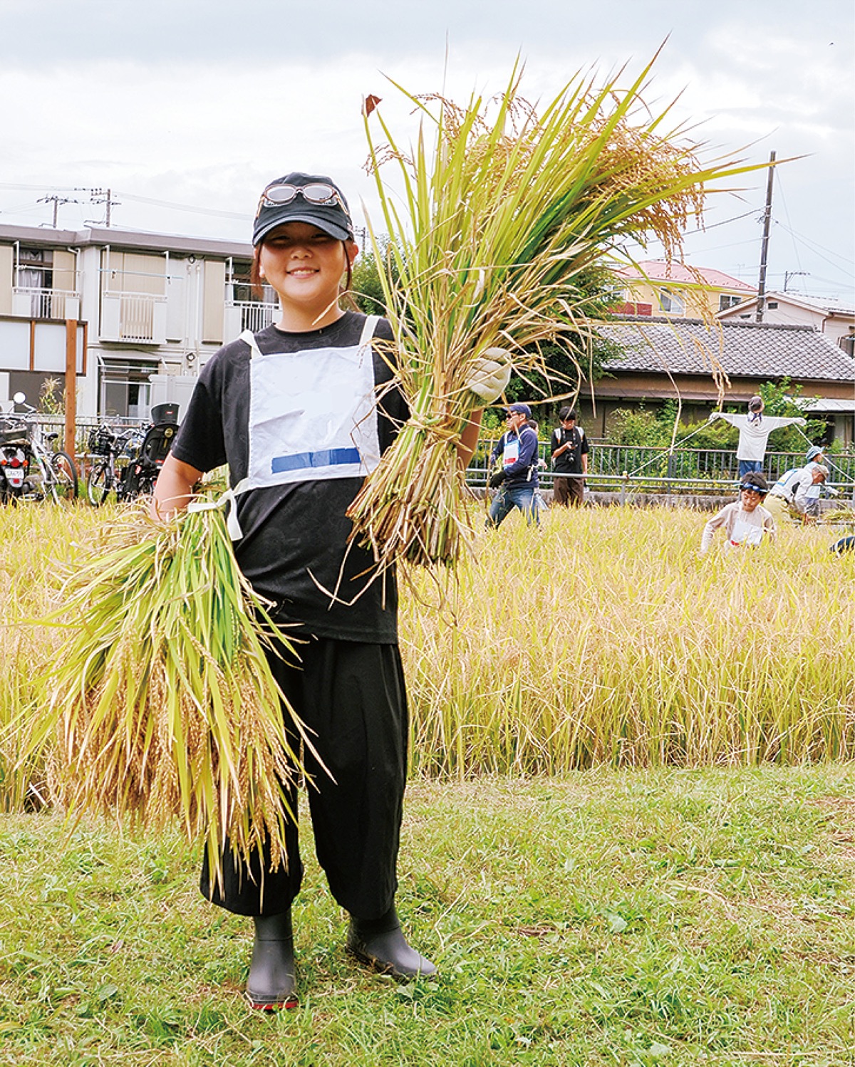 束ねた稲を懸命に運んでいた平山梨杏(りん)さん(新井小4年)は「想像以上に稲が重くて束ねるのが難しかったけど、初めてのことで楽しかった」と感想を話した。