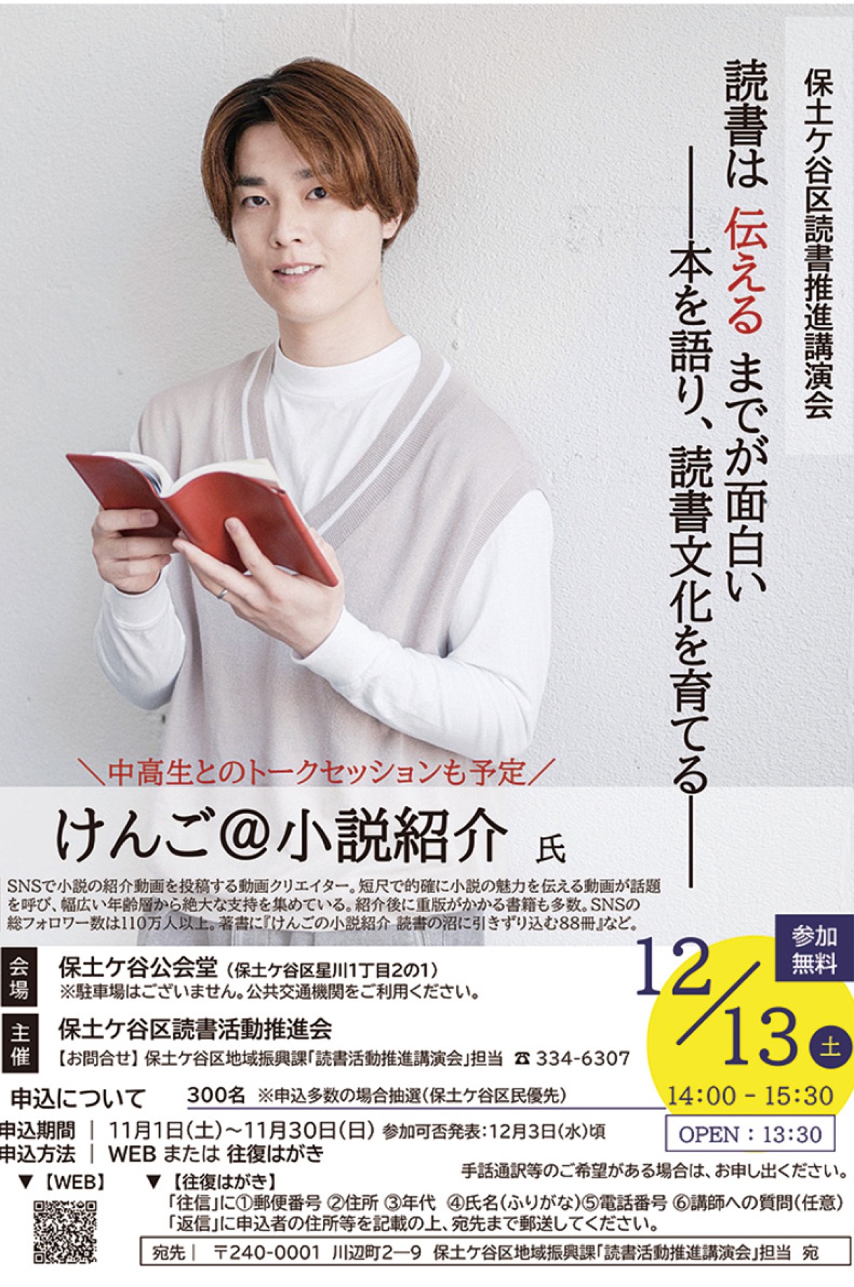 保土ケ谷区民が読書に親しみ楽しむ機会を広げることを目的とした「読書活動推進講演会」が12月13日(土)、保土ケ谷公会堂で開催される。午後2時から3時30分まで。保土ケ谷区読書活動推進会の主催。SNSで小説の紹介動画を投稿する動画クリエイターの「けんご@小説紹介」氏を講師に招き、「読書は伝えるまでが面白い〜本を語り、読書文化を育てる〜」をテーマに講演。定員300人(11月1日(土)から応募受付)。また、講演内で行われる「けんご@小説紹介」氏とのトークセッションの参加者(中高生10人)を募集中(10月31日(金)まで)。問い合わせは、保土ケ谷区地域振興課「読書活動推進講演会」担当【電話】045・334・6307へ。