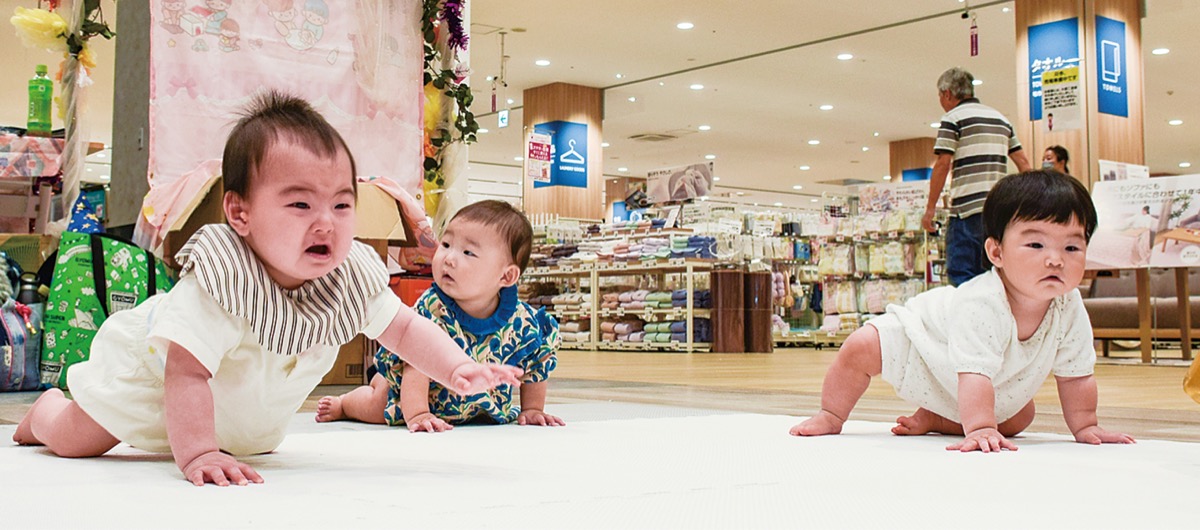 0歳から2歳までの子どもを対象としたハイハイレースには、約20組が参加。スタート直後に泣き出してしまう子が多く見られたが、泣きながらも両親目掛けてハイハイをしながら前に進んでいた。我が子が1位になった母親は「この子がハイハイをする時期は今だけなので参加しようと思った。子どもが好きな絵本を見せながら呼び寄せた」と話す。また、千縁(ちより)ちゃん(9カ月)を連れ都内から参加した大堀さん夫婦は「色々探して今回のハイハイレースを見つけた。泣いてしまったら1位は難しいかなと話していた。泣かなかったけど止まってしまった」と振り返った。