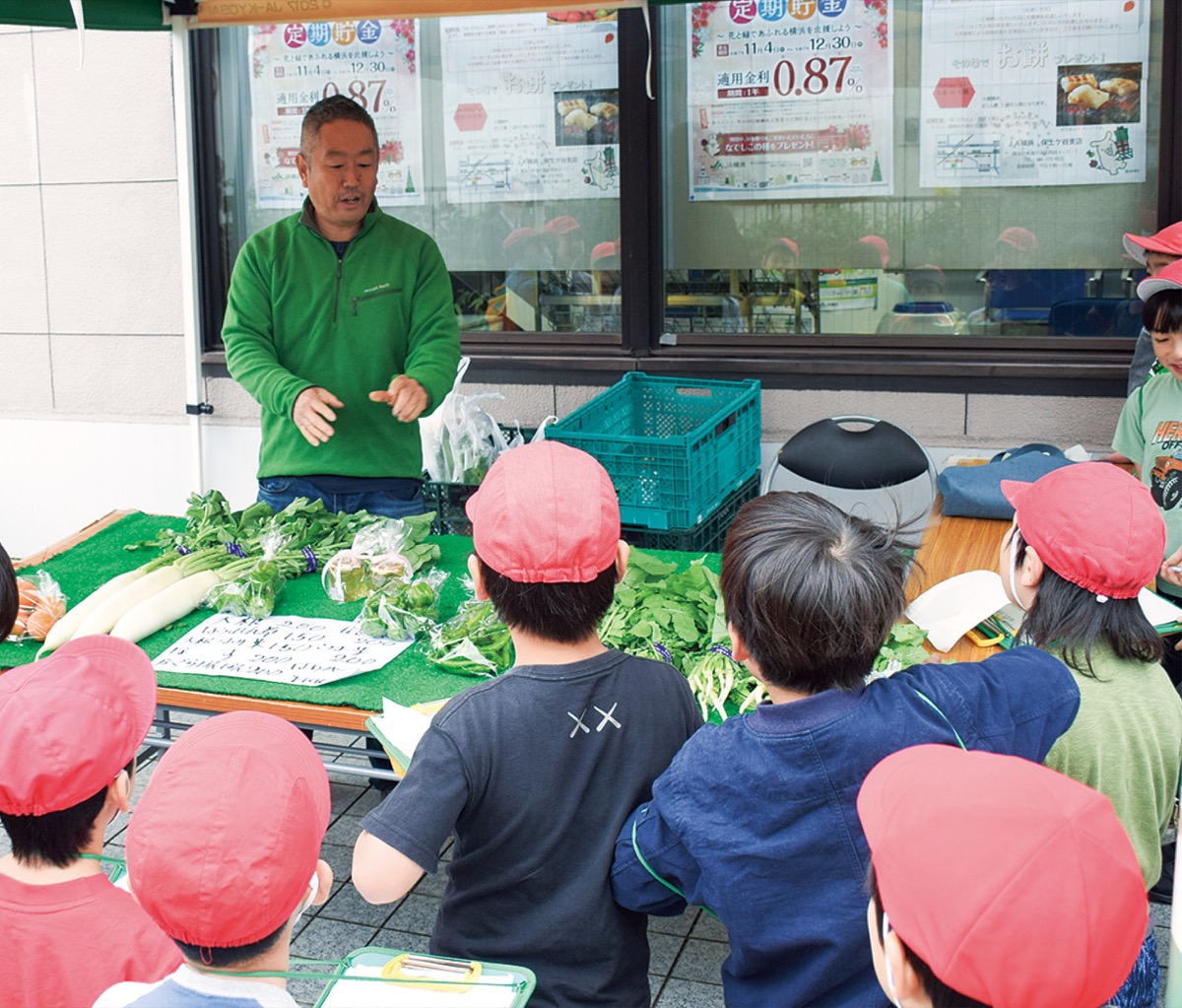 JA横浜保土ケ谷支店を訪れたグループは、同支店で毎週火曜日と金曜日の午前9時から10時に実施している西谷朝市直売会で野菜を出品している三村大輔さん(なないろ畑)に対して質問を投げかけた。