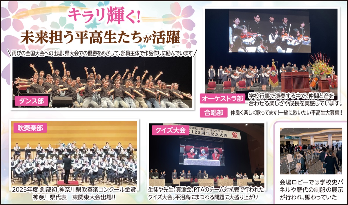 第2部は吹奏楽部の華やかな演奏でスタート。テレビ番組さながらの盛り上がりとなったクイズ大会やダンス部のパフォーマンスなど、現役平高生がステージ上で躍動し、「未来」を感じる構成に。母校での思い出話を語る先輩座談会では、高校生ならではのエピソードが次々と飛び出し、終始会場が笑いに包まれていた。式典のフィナーレでは再び吹奏楽部が登場し、『銀河鉄道999』を演奏。それにあわせたダンス部の踊りや会場が一体となった手拍子で、大盛況の中締めくくられた。