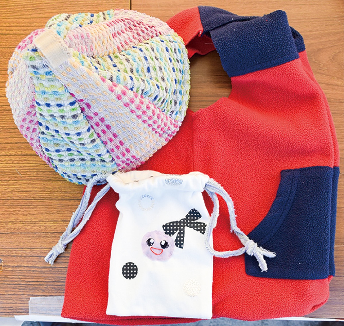 同校の6年1組と2組も祭りに参加。1組は間伐材を利用し、キーホルダーやコースターを作って販売した。また、2組は「地域とつながる」をテーマに周辺の天然温泉「満天の湯」とコラボ。他学年や職員にも不要な衣類の寄付を呼び掛け、サウナハット、エコバッグ、巾着袋を作成して販売した。
