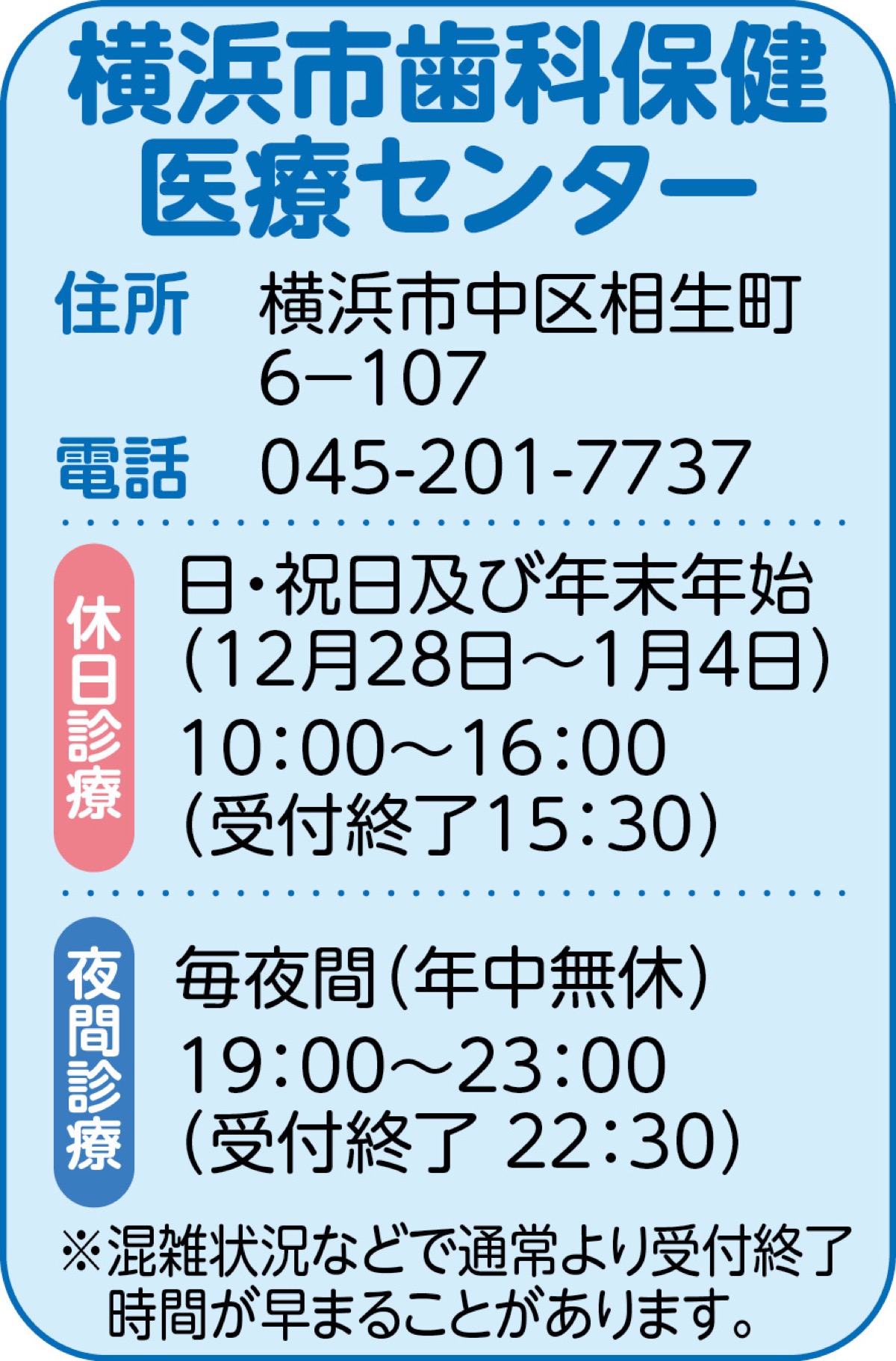 横浜市歯科医師会では、年末年始も横浜市歯科保健医療センターで休日・夜間の救急歯科診療を行っています。詳細は横浜市歯科医師会または横浜市歯科保健医療センターのウェブサイトからご覧ください。受診の際、院内では感染予防対策のためマスクの着用をお願いします。状況により診療制限や、待合室での待機人数の制限が行われる可能性がありますので、付き添い等は最小限の人数で御来院ください。発熱など感染症の疑いがある方は診察できないこともあります。