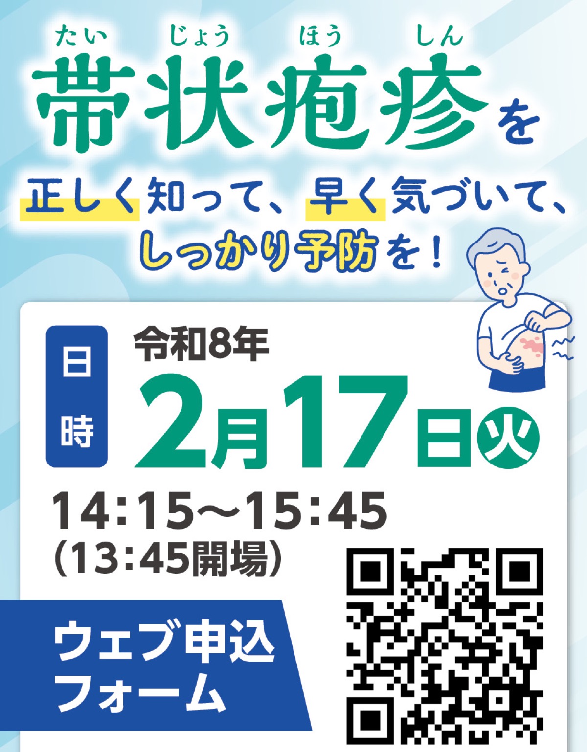 帯状疱疹は加齢に伴う免疫力の低下で発症リスクが高まる。講演では、見落としがちな初期症状や日常生活の注意点、ワクチン接種の重要性について、横浜総合病院皮膚科部長の鈴木琢氏が解説する。先着300人。