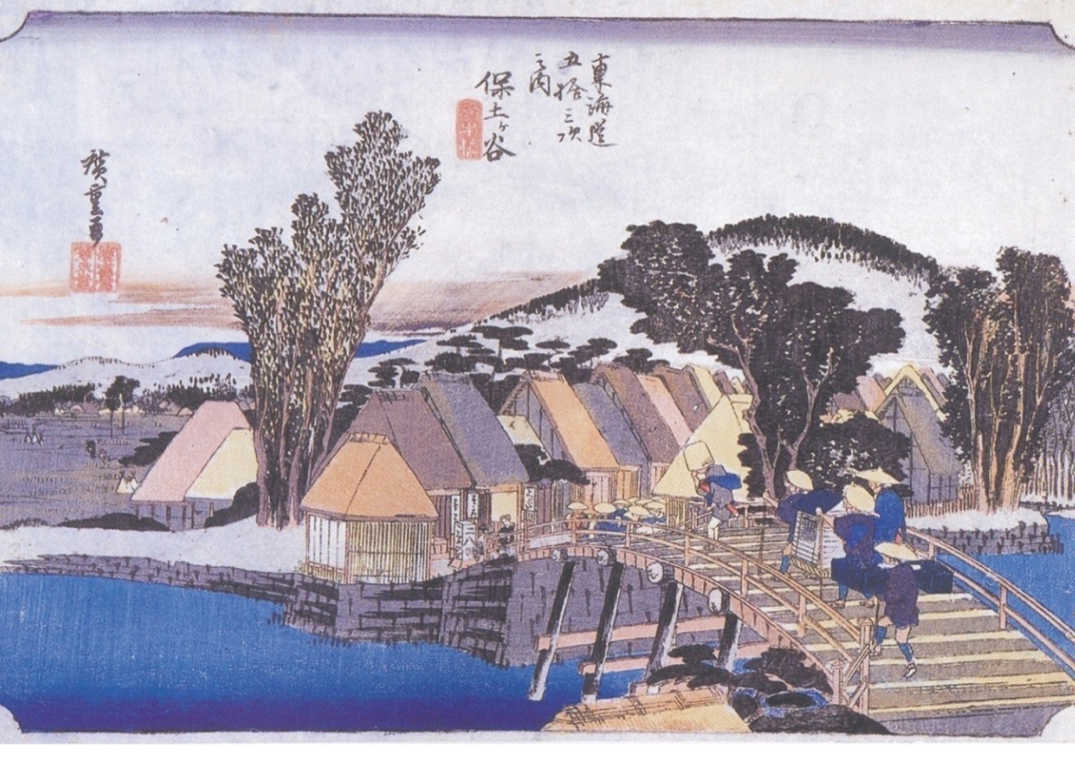 さて、写真2は江戸中期の保土ケ谷宿の町並みを画いた保土ケ谷宿絵図です。茶色の線が旧東海道で、ほぼ現在の東海道線に沿っています。水色の線が帷子川で、茶色の旧東海道が帷子川を横切っているところが今の天王町駅前で、ここに浮世絵で有名な新町橋(帷子橋/写真3)がありました。