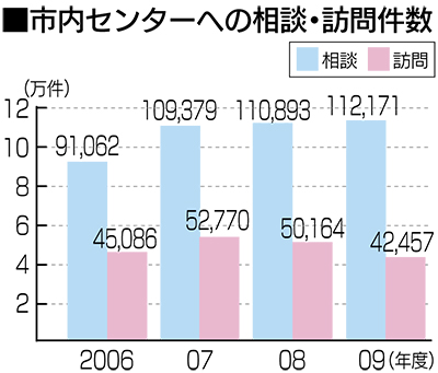 鶴見区のセンター設置数は8カ所。市内の相談件数は年間10万件を超え、増加傾向にある(=表参照)。訪問件数の減少については「地域の見守り活動など、センターに直接行かなくても済む仕組みができつつあるのでは」との見方もある。