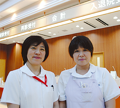 「初めて来る病院は不安なもの。なるべく患者さんと顔を合わせて、不安や訴えに耳を傾けることがモットー」。そう語るのは、同院外来の看護課長代理・渡邉節子さん(写真左)。