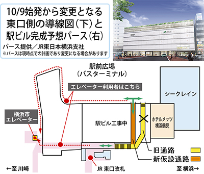 JR鶴見駅で現在建築中の駅ビル「シァル」の新築工事にともない、10月9日の始発時刻から、東口改札側の仮設通路の位置が変更される。