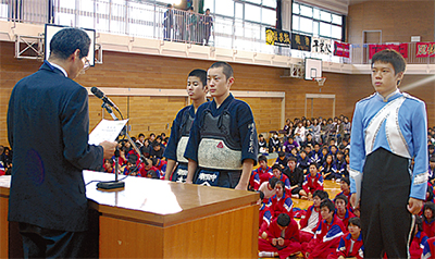 表彰は、山崎区長が直接各校を訪問し行われた。マーチングバンド部と剣道部が全国大会で活躍した潮田中は、10月21日、同校で例年この時期にある部活動伝達式の中で授与された。