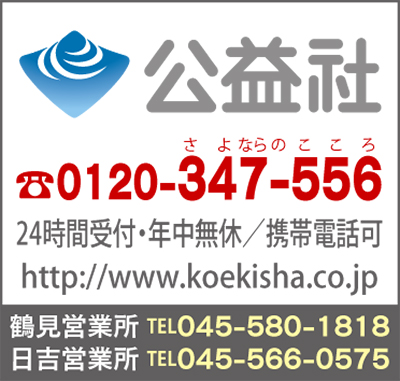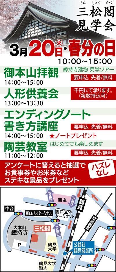 創業80周年、まごころ込めた葬儀でおなじみの(株)公益社では3月20日(火・祝)午前10時から、鶴見駅そばの大本山總持寺三松閣で春の見学会を開催する。歴史と伝統ある三松閣は家族葬から大規模な葬儀まで利用できる式場。当日は修行僧が説明してくれる御本山拝観(要申込)のほか、エンディングノートプレゼント付きの書き方セミナー(要申込)、陶芸教室、占い、縁日、リラクゼーションマッサージなど、すべて無料。また新鮮野菜100円均一や人形供養会(要申込・千円〈複数可〉)など家族そろって参加できるイベント満載。参加の申込み、問い合わせは左記まで。