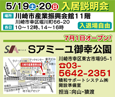 入居一時金0円の介護付有料老人ホーム「Sアミーユ御幸公園」(幸区東古市場95の1)が7月1日、オープンする。同施設では5月19日(土)と20日(日)、入居説明会を川崎市産業振興会館で行う。施設の詳細や普段の疑問点を聞くチャンス。ぜひお見逃しなく!