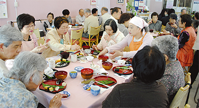 5月19日は、区内ですし店を営んでいた元職人の寺堀優さんが腕前を披露。参加した約30人が舌鼓を打った。馬場町在住の91歳の女性は、「毎回楽しみ。参加すればみんな友だち」と楽しげな様子だった。