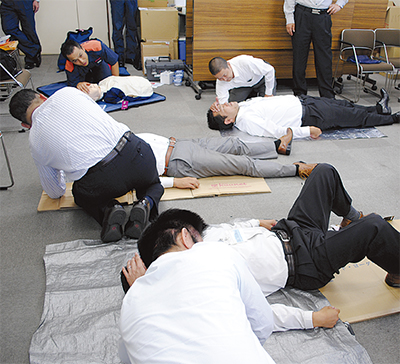 当日は同オフィスに勤務する社員13人全員が参加。心肺蘇生法やAEDの操作など、救命処置を座学や実技で学んだ。