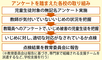 今回の調査で具体事例把握はできないが、市は「教師が気付いていないいじめが、どの程度あるかの把握が第一。あると意識して観察すれば、個別事例も掴める」と話す。アンケート結果を踏まえて教職員アンケートも行い、悩みを抱えた生徒児童を特定。そのいじめに適切な対応が行われているかを学校全体で共有し、46点検項目で確認する。