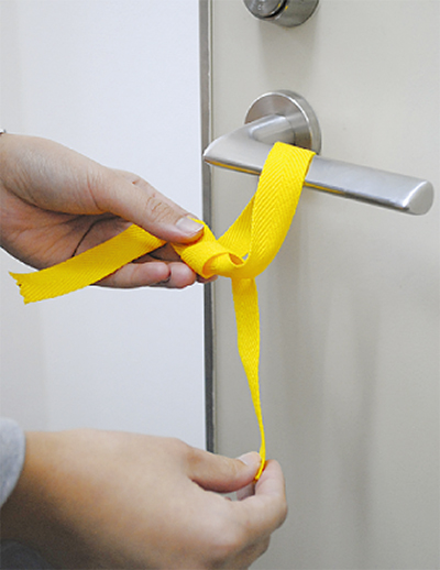 黄色いリボンは「無事」の証――。地域で福祉保健活動を推進する矢向あいねっと推進委員会(鈴木憲三会長)と江ヶ崎・あいねっと推進協議会(茂内哲子会長)がこのほど、地震などの災害時に円滑な救助を行おうと、家の周囲に結ぶことで無事を知らせるための黄色いリボンを地区内の各家庭に配布した。