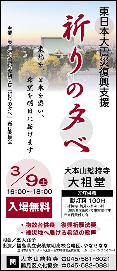 歌声で東北へ思いを届けようという東日本大震災復興支援企画、「祈りの夕べ」が3月9日(土)午後4時から6時まで、大本山總持寺の大祖堂で行われる。主催は大本山總持寺、鶴見区文化協会、鶴見大学、鶴見歴史の会からなる実行委員会。鶴見区役所、鶴見区自治連合会、鶴見区商店街連合会、横浜東ロータリークラブ、YOUテレビ(株)、ナイス(株)、公益社団法人鶴見法人会、京浜急行電鉄(株)、大本山總持寺白字会、鶴見区老人クラブ連合会、(株)タウンニュース社が後援する。