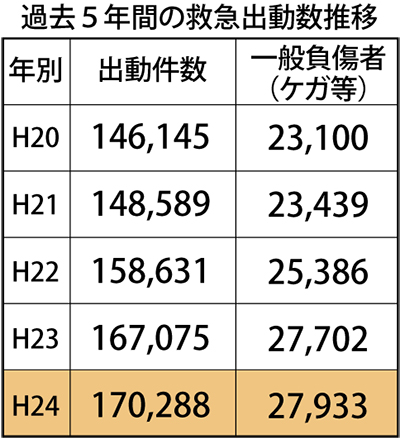 救急出動の過去最多を記録した昨年は、17万288件に上った。その内訳は、急病が11万4019件と最も多く、次いで多かったのがケガなどによる一般負傷で2万7933件だった。